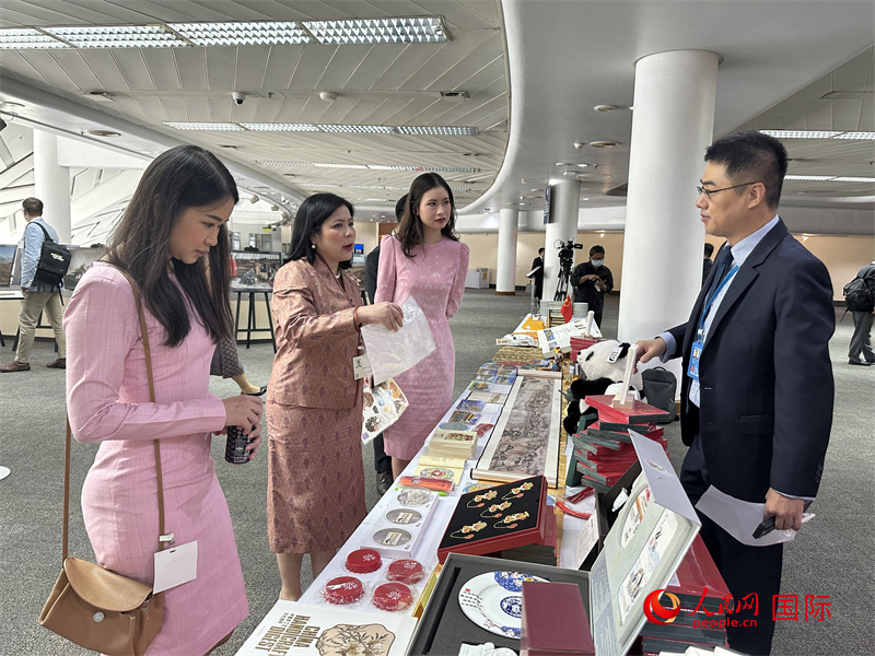 與會代表在中國展臺前欣賞傳統(tǒng)手工藝品感受中華文化。人民網(wǎng)記者 孫廣勇攝