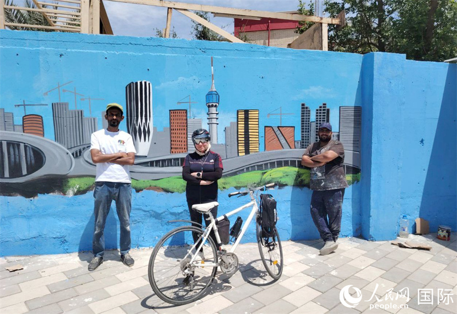 一位街頭騎行者和藝術(shù)家在壁畫(huà)墻前合影。人民網(wǎng) 伊納斯·易卜拉欣攝