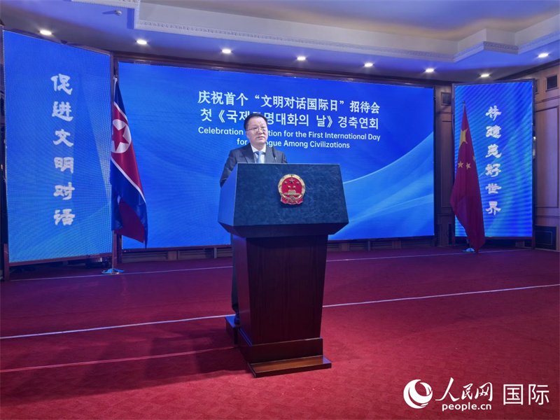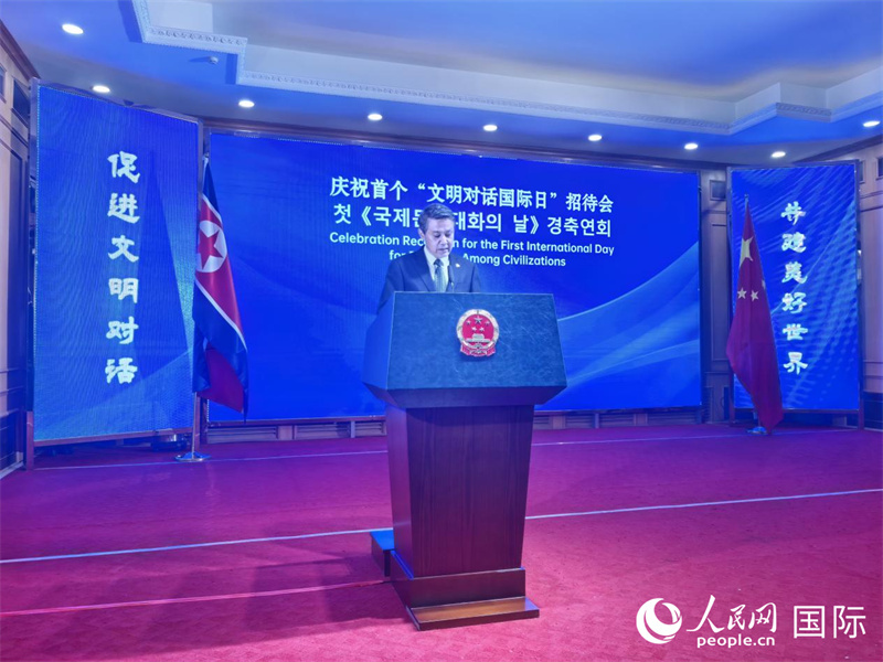 當(dāng)?shù)貢r(shí)間6月17日,中國(guó)駐朝鮮使館舉辦慶祝首個(gè)“文明對(duì)話國(guó)際日”招待會(huì)。圖為中國(guó)駐朝鮮大使王亞軍致辭。人民網(wǎng)記者 劉融攝