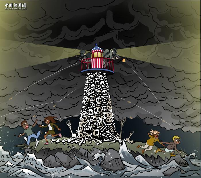 美式“人權”就如同畫中的燈塔,外觀莊嚴,塔身卻堆滿了骸骨。這不僅象征過去的罪行,也在持續(xù)上演著對人權的踐踏。