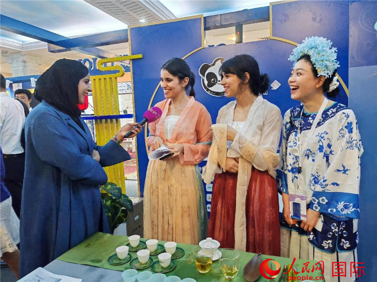 突尼斯當(dāng)?shù)孛襟w在中國聯(lián)合展臺采訪。人民網(wǎng)記者 管克江攝