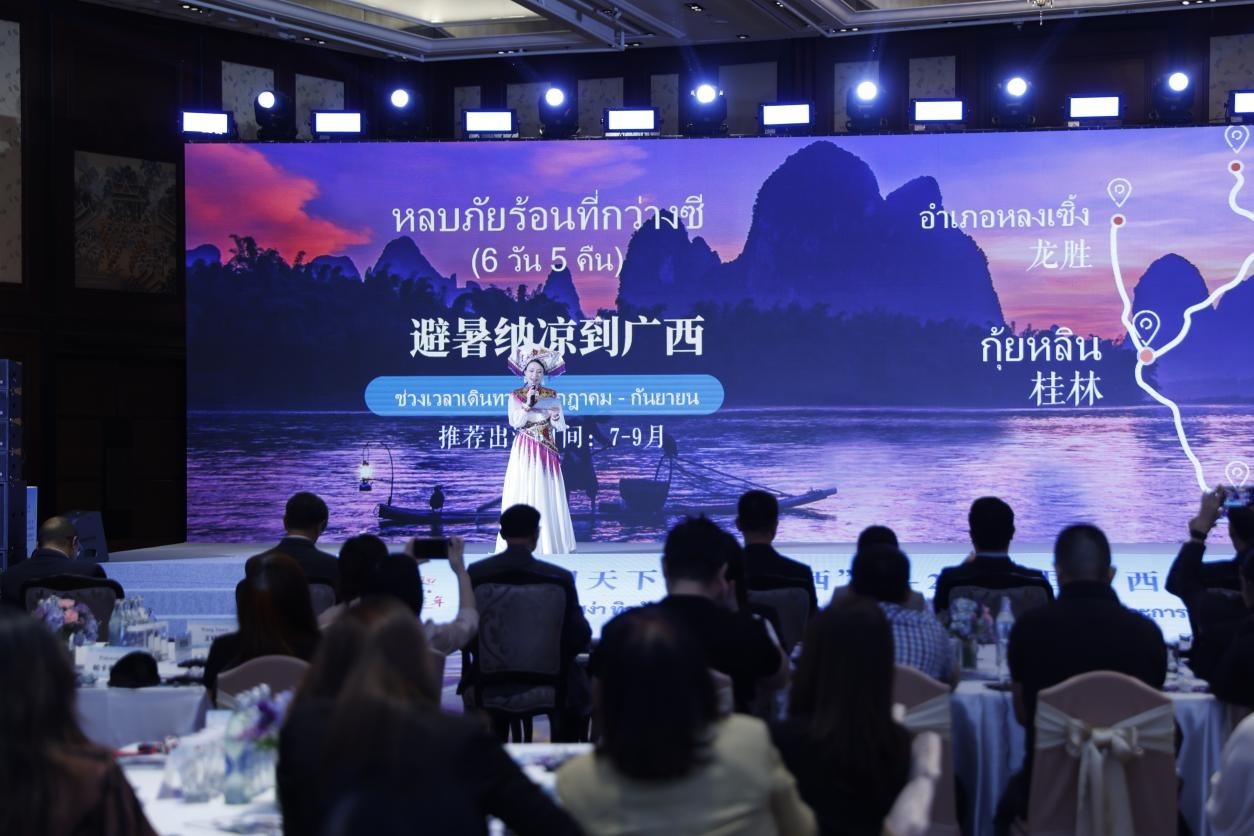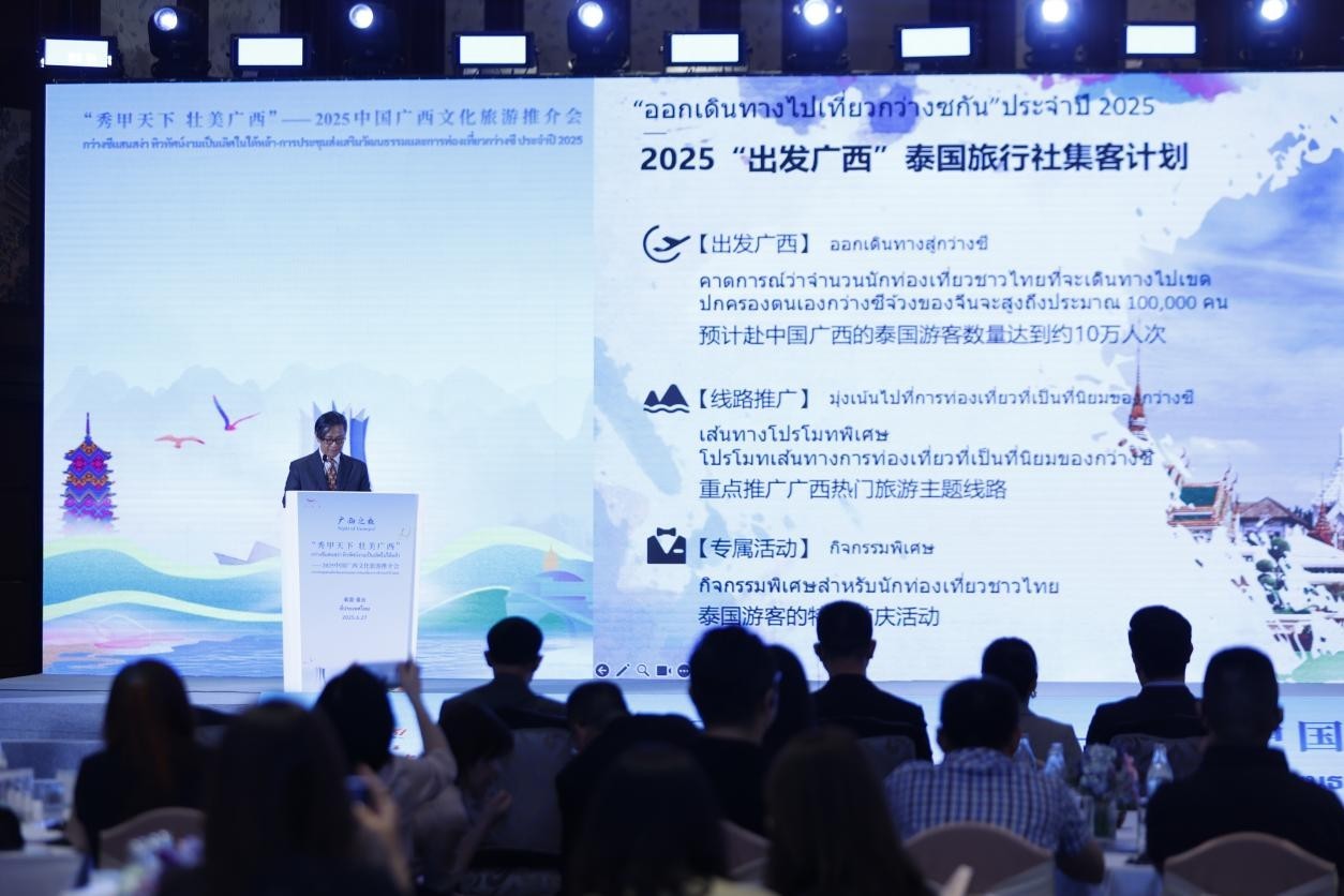 賈卡蓬·當素提坦在致辭中表示,今年是泰中建交50周年暨“泰中友誼金色50年”,兩國關系邁入歷史新高度。在這一重要節(jié)點上,廣西作為中國—東盟合作前沿和文旅資源富集之地,舉辦本次旅游推介活動,不僅為泰國民眾打開了了解廣西文化與自然的窗口,也為泰國旅游業(yè)界提供了更多合作的可能。泰方愿同廣西一道,通過媒體聯(lián)動、渠道合作、內(nèi)容共創(chuàng)等方式,共同擴大雙方旅游品牌在區(qū)域和國際市場的影響力,實現(xiàn)客源互引、互利共贏的良好局面。