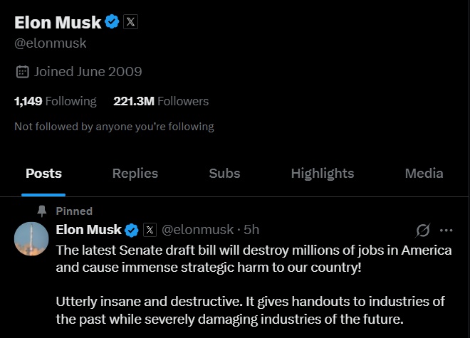 當(dāng)?shù)貢r(shí)間6月28日,美國(guó)企業(yè)家埃隆·馬斯克在社交媒體平臺(tái)上發(fā)文表示,美國(guó)參議院關(guān)于大規(guī)模稅收與支出法案的最新草案“將摧毀美國(guó)數(shù)百萬(wàn)個(gè)就業(yè)崗位,并對(duì)美國(guó)造成巨大的戰(zhàn)略傷害”。馬斯克還說:“這項(xiàng)法案將債務(wù)上限提高5萬(wàn)億美元,這是歷史上最大的增幅,讓美國(guó)走上被債務(wù)奴役的快車道?!?/p>