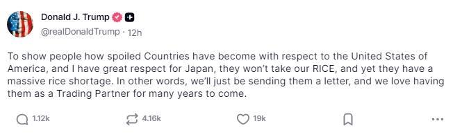 據(jù)報道,特朗普當(dāng)天在社交媒體上發(fā)文說,“我對日本懷有極大的敬意,他們卻不愿進(jìn)口我們的大米,而他們自己正面臨嚴(yán)重的米荒。換句話說,我們只需要發(fā)一封信(就能解決)。我們愿在未來多年里讓他們繼續(xù)做貿(mào)易伙伴?!?/p>