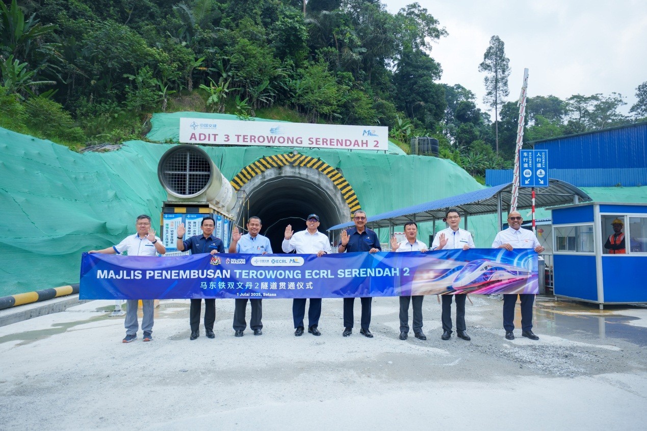 馬來(lái)西亞?wèn)|海岸鐵路(馬東鐵)項(xiàng)目雙文丹2號(hào)隧道貫通儀式舉行。中交馬東鐵項(xiàng)目總經(jīng)理部供圖