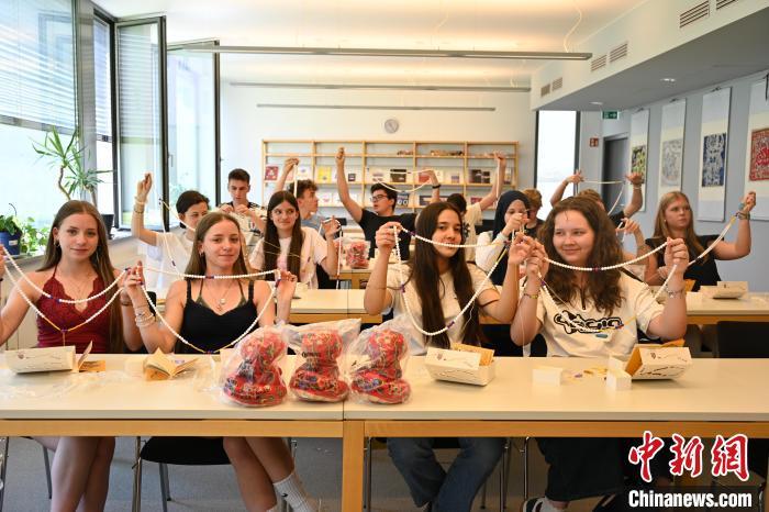 來自德累斯頓艾爾弗雷德-瓦爾特-馮-契爾豪斯文理中學(xué)的15名九年級(jí)學(xué)生6月17日走進(jìn)柏林中國文化中心,參加了“故宮朝珠DIY”手工課。通過圖文講解,他們了解到朝珠在古代宮廷中的用途、佩戴講究及文化寓意。在老師指導(dǎo)下,孩子們親手穿線、配色、結(jié)繩,認(rèn)真制作一串屬于自己的“朝珠”。