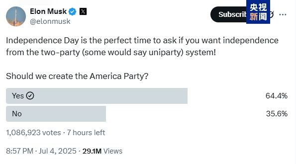 在美國(guó)總統(tǒng)特朗普7月4日將“大而美”法案簽署成法的幾個(gè)小時(shí)前,特朗普的前盟友、企業(yè)家埃隆·馬斯克通過(guò)社交平臺(tái)發(fā)起了一項(xiàng)關(guān)于成立美國(guó)新政黨的投票。