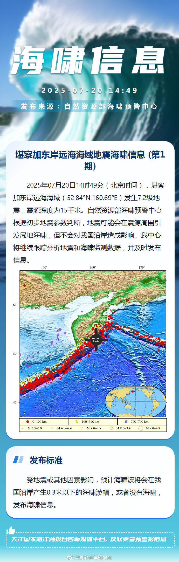 央視網(wǎng)消息:據(jù)國(guó)家海洋預(yù)報(bào)臺(tái)官方微博信息,2025年07月20日14時(shí)49分(北京時(shí)間),堪察加?xùn)|岸遠(yuǎn)海海域(52.84°N,160.69°E)發(fā)生7.2級(jí)地震,震源深度為15千米。自然資源部海嘯預(yù)警中心根據(jù)初步地震參數(shù)判斷,地震可能會(huì)在震源周?chē)l(fā)局地海嘯,但不會(huì)對(duì)我國(guó)沿岸造成影響。中心將繼續(xù)跟蹤分析地震和海嘯監(jiān)測(cè)數(shù)據(jù),并及時(shí)發(fā)布信息。