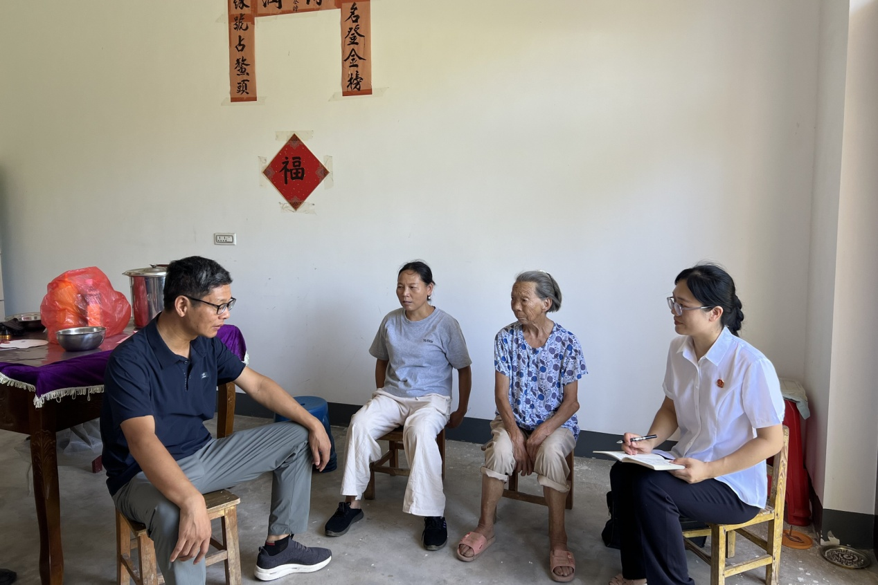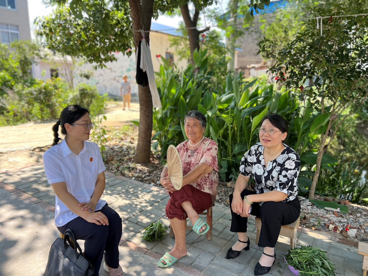 在村路邊的大樹底下,詹伍權(quán)主席與李舒庭長遇到一位乘涼的老奶奶,兩人主動上前噓寒問暖,詳細詢問老人的身體狀況、家庭生活及養(yǎng)老保障情況,叮囑老人注意夏季防暑,并結(jié)合老年人權(quán)益保障法,告知其在贍養(yǎng)、醫(yī)療等方面的合法權(quán)益及維權(quán)途徑。