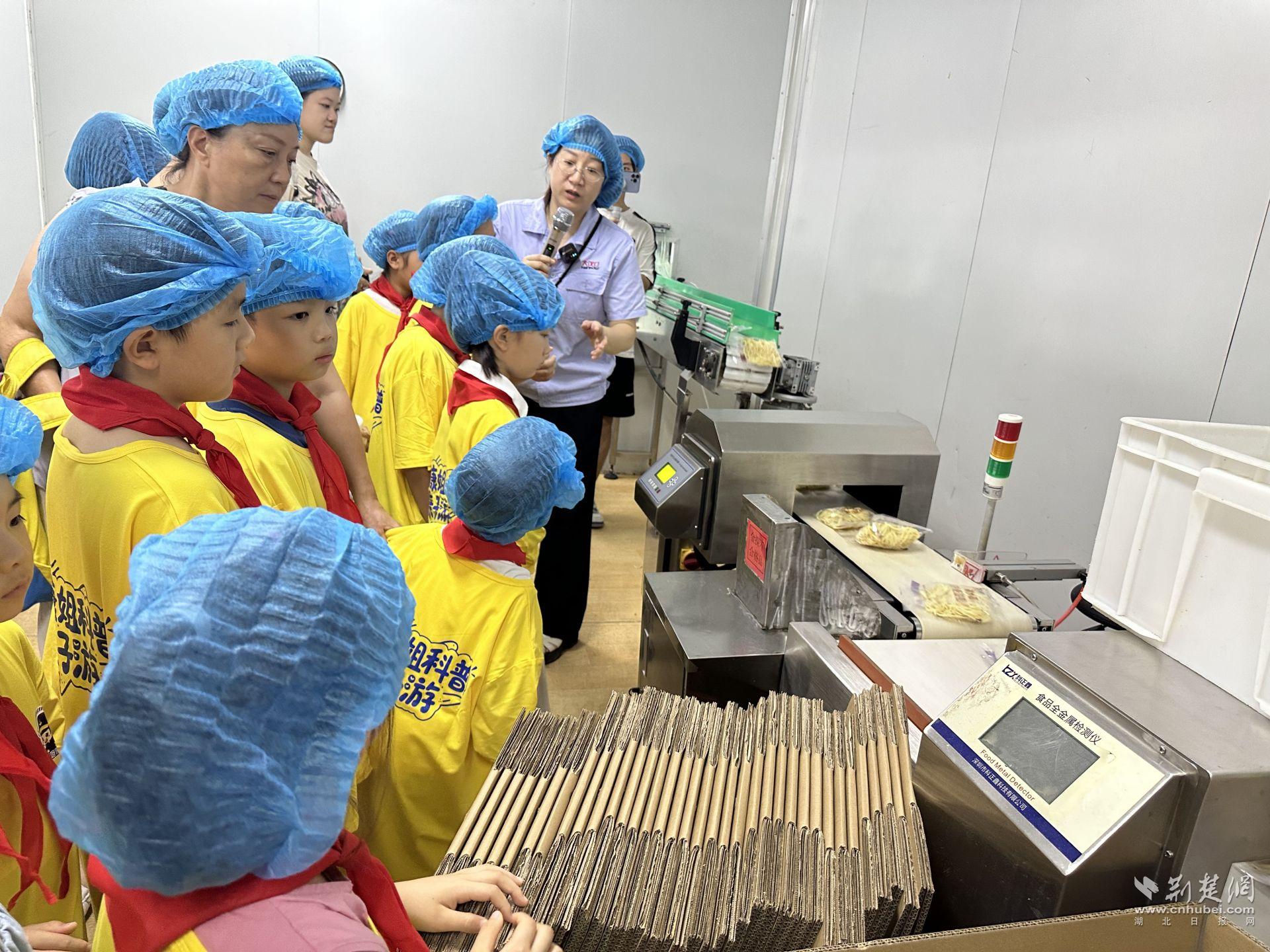 在熱干面生產(chǎn)車間,小朋友們透過玻璃窗,看到生產(chǎn)線上的熱干面源源不斷從傳輸帶送出來,經(jīng)過食品袋密封,再被送到另一個(gè)車間包裝。