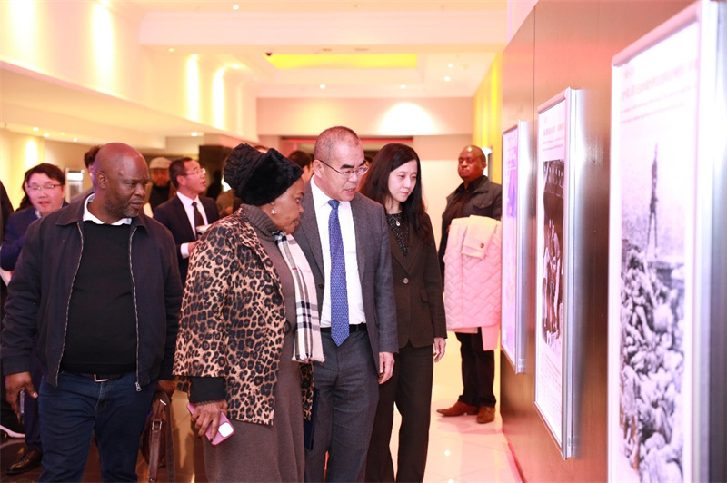 圖為與會(huì)嘉賓共同參觀中國人民抗日戰(zhàn)爭(zhēng)暨世界反法西斯戰(zhàn)爭(zhēng)勝利80周年圖片展。中國駐約翰內(nèi)斯堡總領(lǐng)館供圖