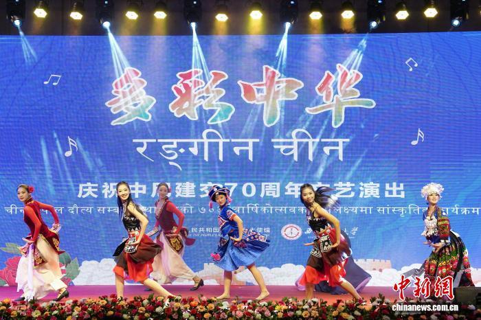 8月1日,中國駐尼泊爾大使館在尼首都加德滿都舉行中尼建交70周年招待會(huì)。圖為慶祝中尼建交70周年主題文藝演出。中新社記者 崔楠 攝