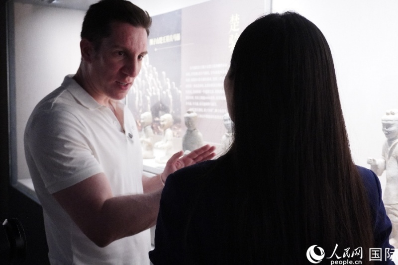 徐州博物館工作人員為人民網(wǎng)外籍專家湖長明(左一)講解漢代陶俑。 人民網(wǎng) 喻亮攝