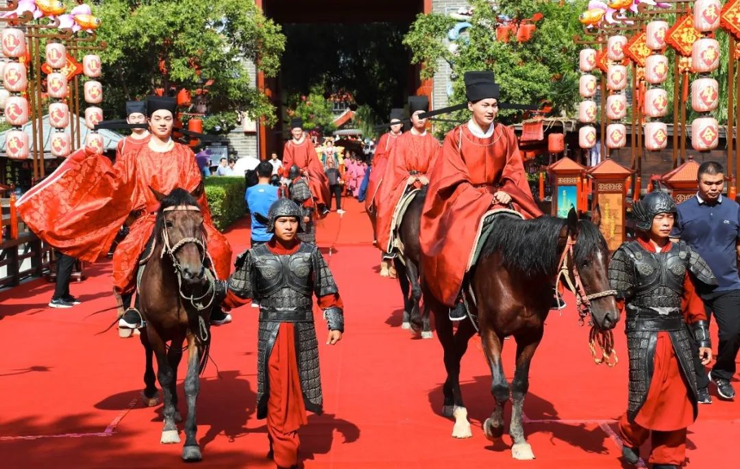 鑼鼓開道、嗩吶齊鳴、同船共渡、高頭大馬、八抬大轎、十里紅妝……整個隊伍浩浩蕩蕩,規(guī)模十足。