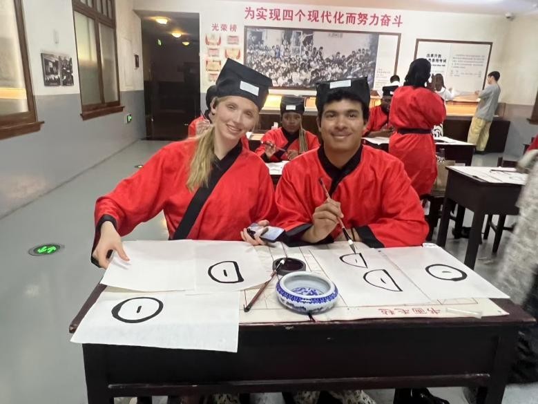 訪華團(tuán)成員體驗(yàn)書(shū)法藝術(shù)。上海杉達(dá)學(xué)院南非中國(guó)文化和國(guó)際教育交流中心孔子課堂供圖