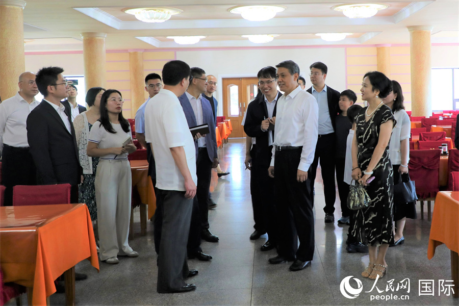 當?shù)貢r間8月13日,中國駐朝鮮大使王亞軍率使館外交官等參觀平壤金正淑紡織廠。圖為中方一行參觀工廠食堂。人民網(wǎng)記者 劉融攝