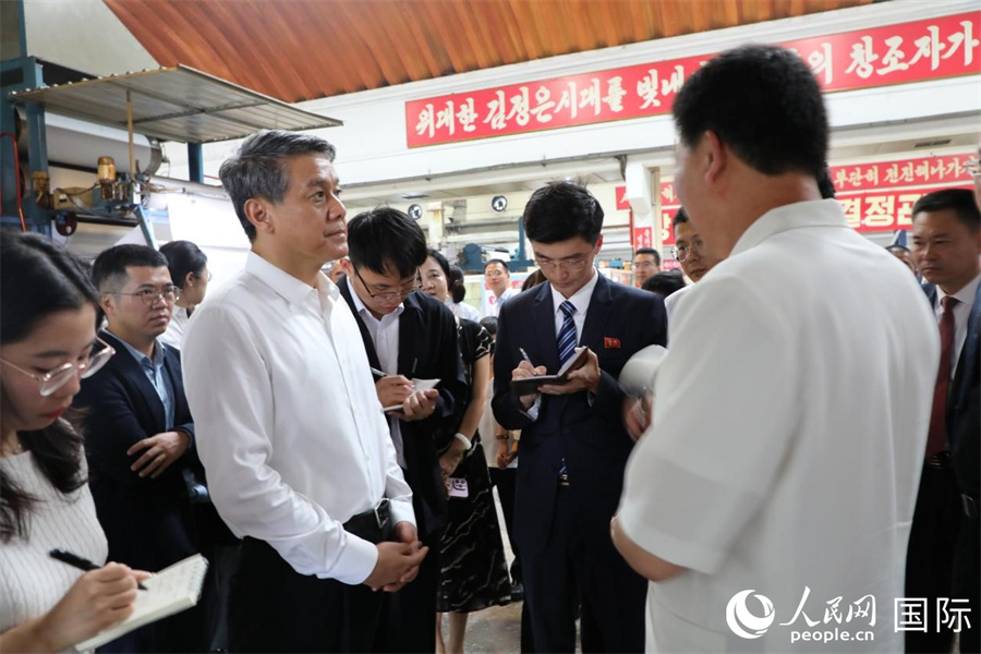 當?shù)貢r間8月13日,中國駐朝鮮大使王亞軍率使館外交官等參觀平壤金正淑紡織廠。圖為李勇根介紹工廠歷史沿革、生產(chǎn)能力、發(fā)展理念等情況。人民網(wǎng)記者 劉融攝