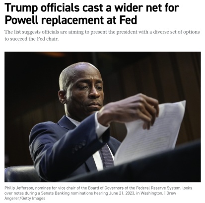 △美國(guó)《政治》新聞網(wǎng)站報(bào)道,特朗普政府正在拓展接替鮑威爾的人選范圍。