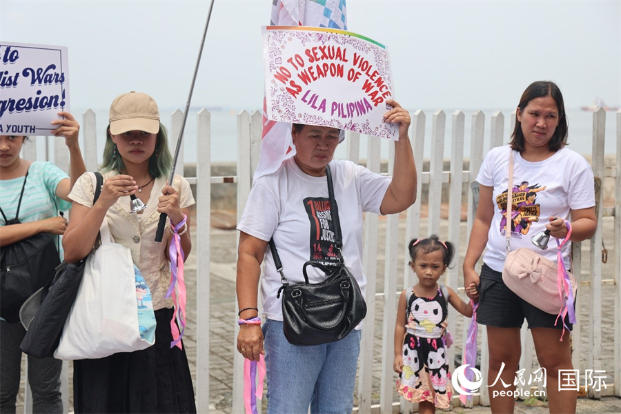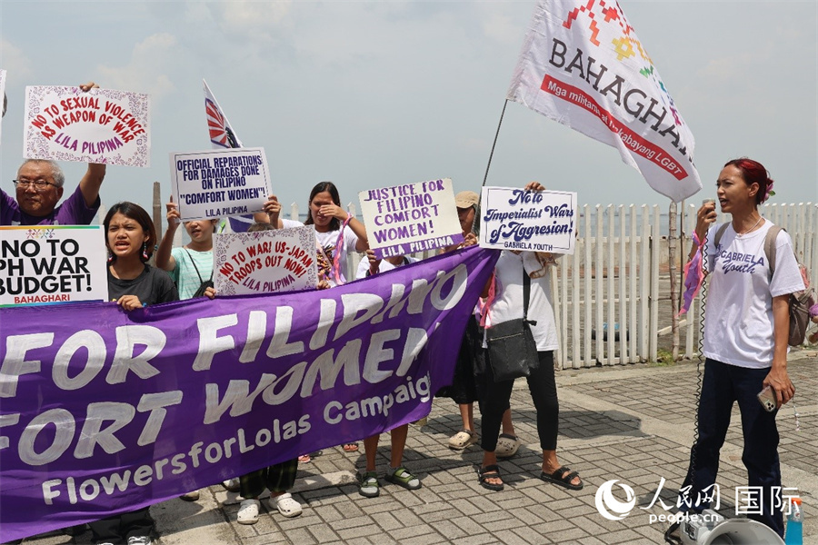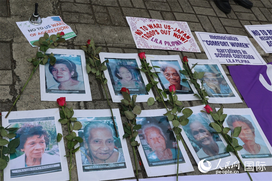 菲律賓民眾在拆除的“慰安婦”紀(jì)念雕像舊址旁舉行紀(jì)念日集會,寄托哀思并敦促日本政府承認(rèn)戰(zhàn)爭罪行。人民網(wǎng)記者 樊帆攝