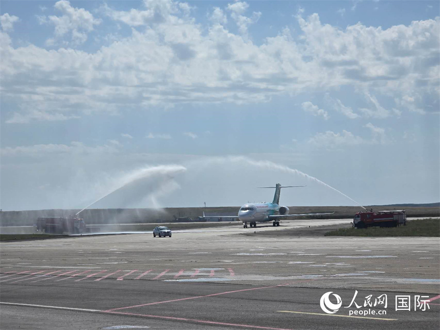 中國(guó)商飛C909型機(jī)抵達(dá)卡拉?達(dá)并穿越水門(mén)。人民網(wǎng)記者 李強(qiáng)攝