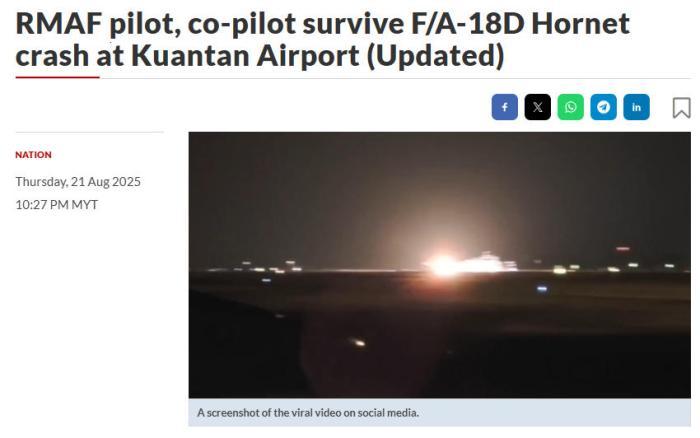 中新網(wǎng)8月22日電 綜合馬來(lái)西亞《星報(bào)》等媒體報(bào)道,當(dāng)?shù)貢r(shí)間21日晚間,馬來(lái)西亞空軍的一架F/A-18D“大黃蜂”戰(zhàn)斗機(jī)在該國(guó)關(guān)丹空軍基地發(fā)生事故墜毀。