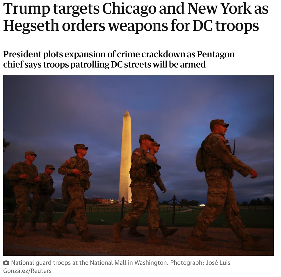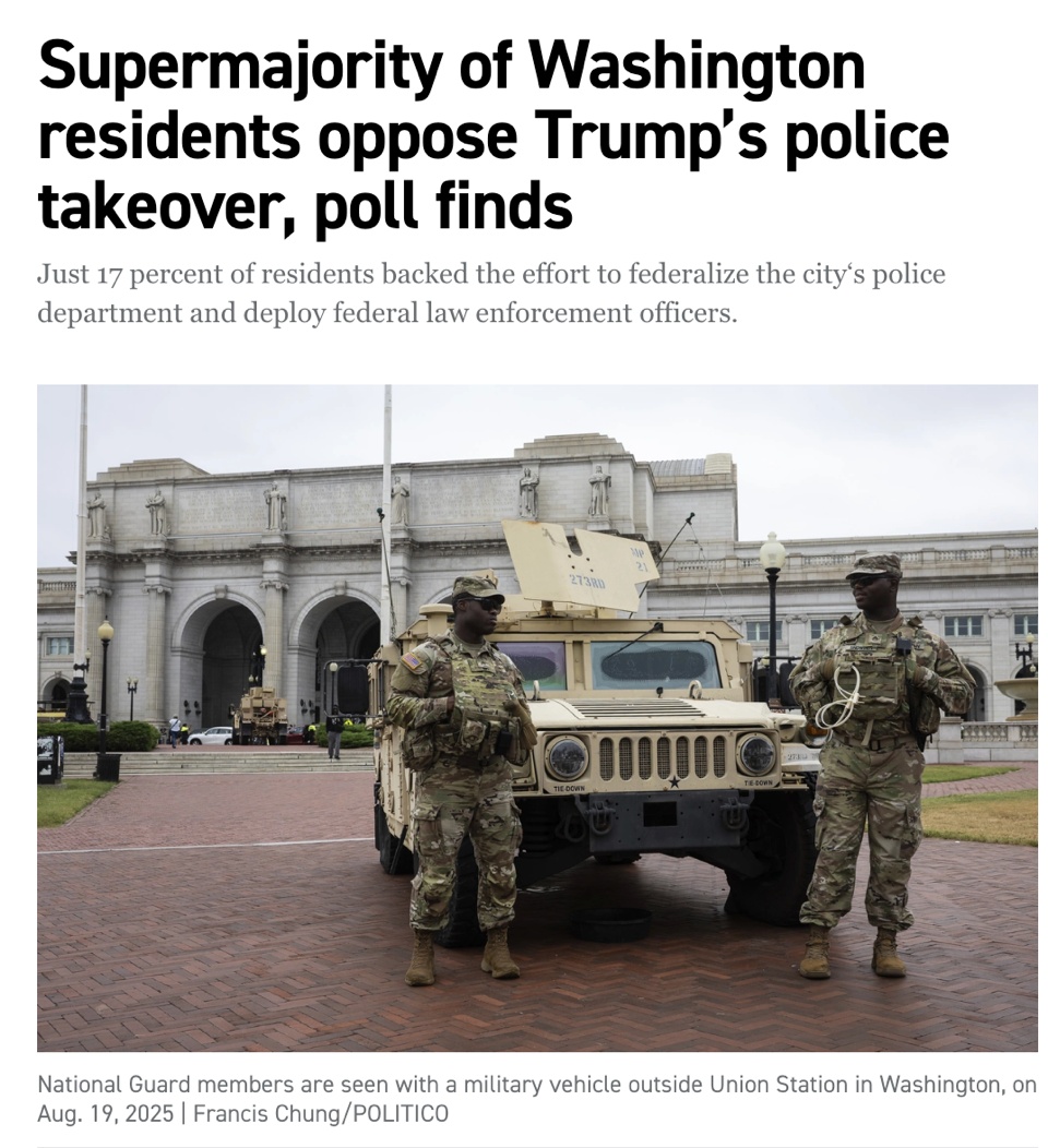 △美國“政治”網(wǎng)站報道,79%的華盛頓特區(qū)居民反對聯(lián)邦接管特區(qū)警務(wù)并部署國民警衛(wèi)隊的做法。