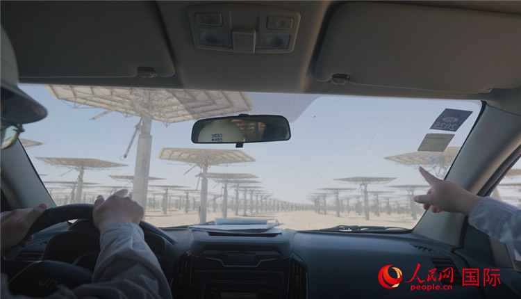 在新疆哈密50兆瓦熔鹽塔式光熱發(fā)電站,工作人員駕駛汽車(chē)穿行在定日鏡之間進(jìn)行作業(yè)。人民網(wǎng)記者 袁蒙攝