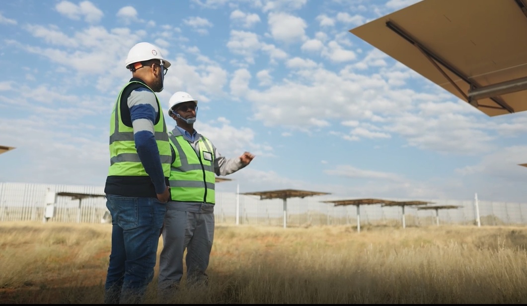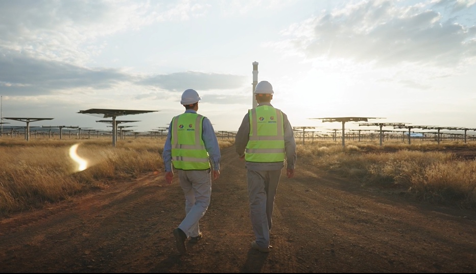 在南非紅石100兆瓦塔式熔鹽光熱電站項(xiàng)目,中方工作人員和南非工作人員一起工作??烁晁鳌っ飞晨恕つ咏B阿攝