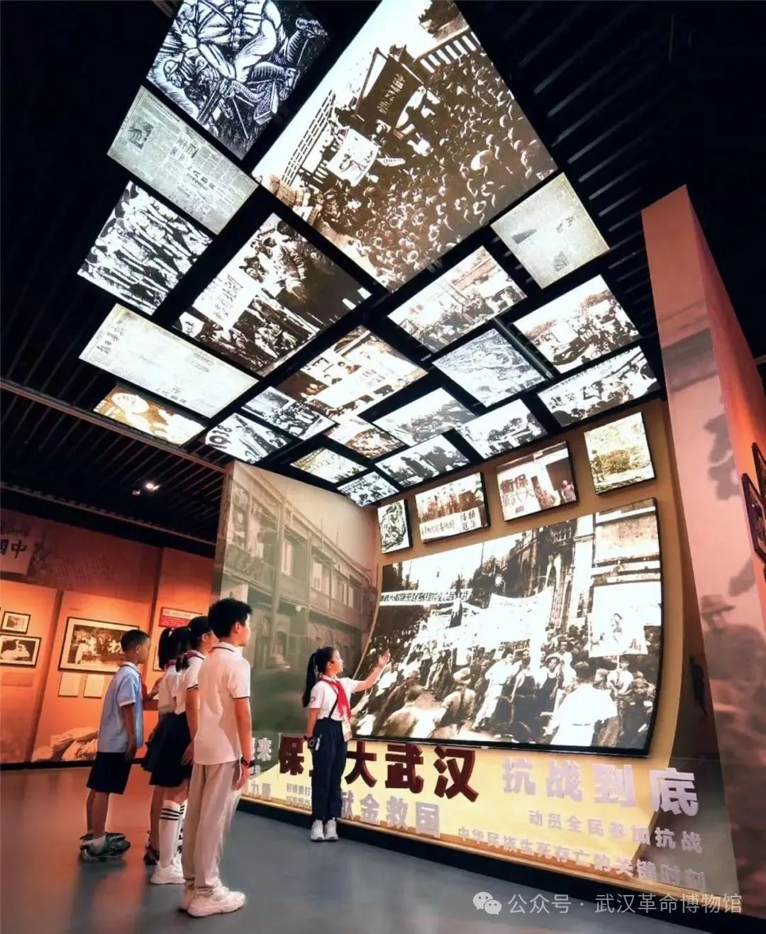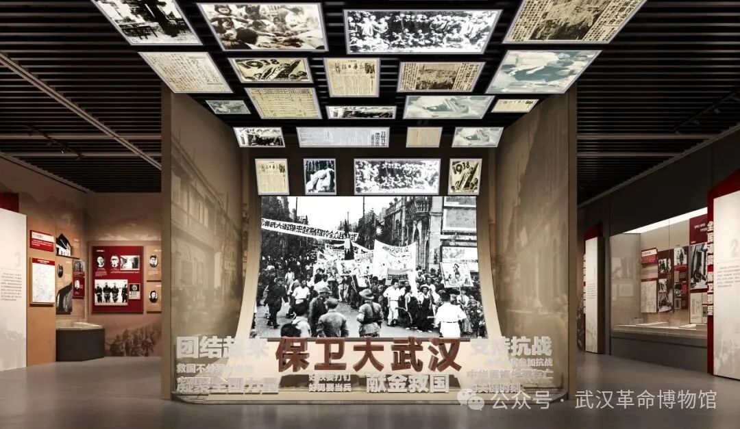 “保衛(wèi)大武漢”場景采用音頻+燈箱照片結(jié)合的方式,展示中國共產(chǎn)黨領(lǐng)導(dǎo)下的“以抗日救亡團(tuán)體為骨干,救亡書刊為導(dǎo)向,救亡活動(dòng)為內(nèi)容”三位一體的抗日救亡活動(dòng),以武漢為中心,迅速席卷全國。