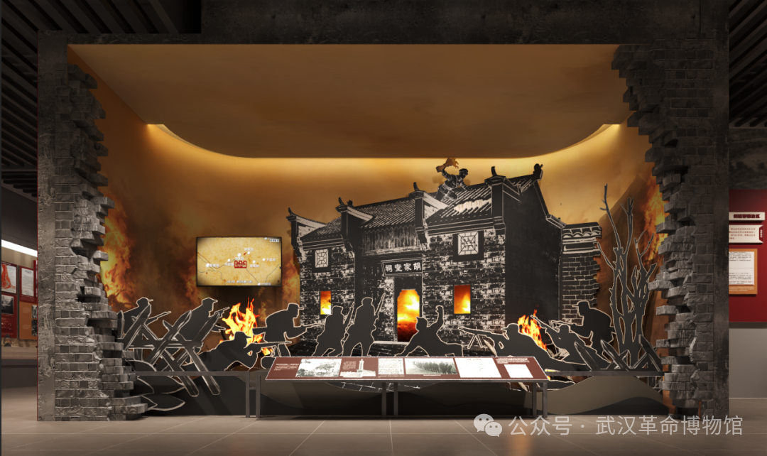 “火燒胡家祠堂”采用藝術(shù)場景+視頻結(jié)合的方式,定格侏儒山戰(zhàn)役中的胡家臺(tái)戰(zhàn)斗,生動(dòng)刻畫出百姓毀家紓難與新四軍第五師并肩作戰(zhàn)的英勇精神,使觀眾身臨其境地感受到勝利來之不易。