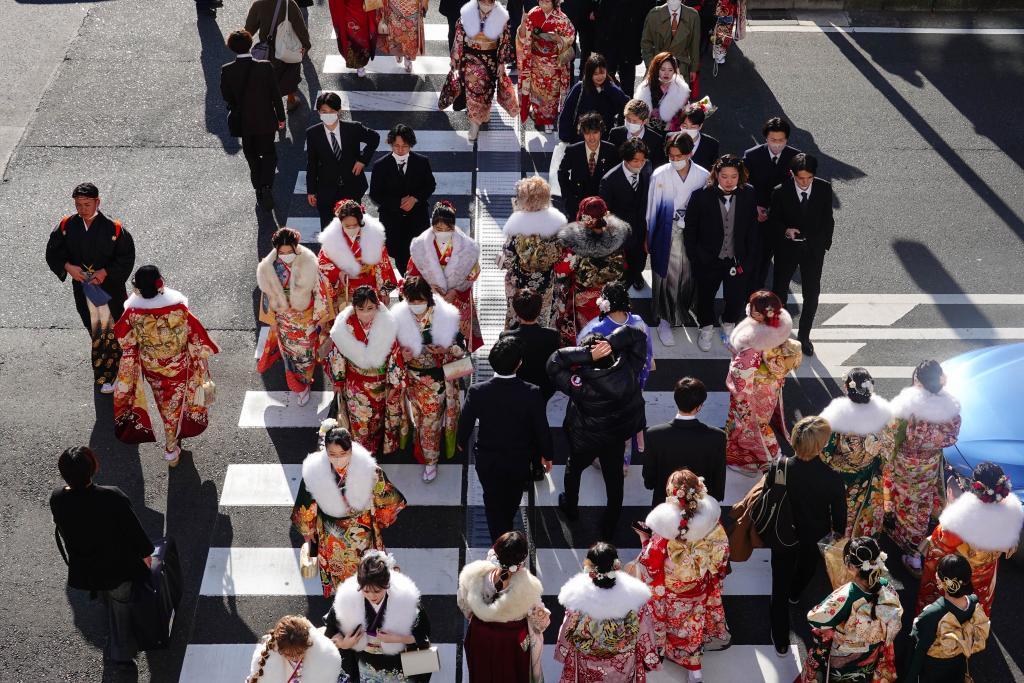 這是2023年1月9日在日本橫濱拍攝的參加成人禮儀式的青年男女。新華社記者張笑宇攝