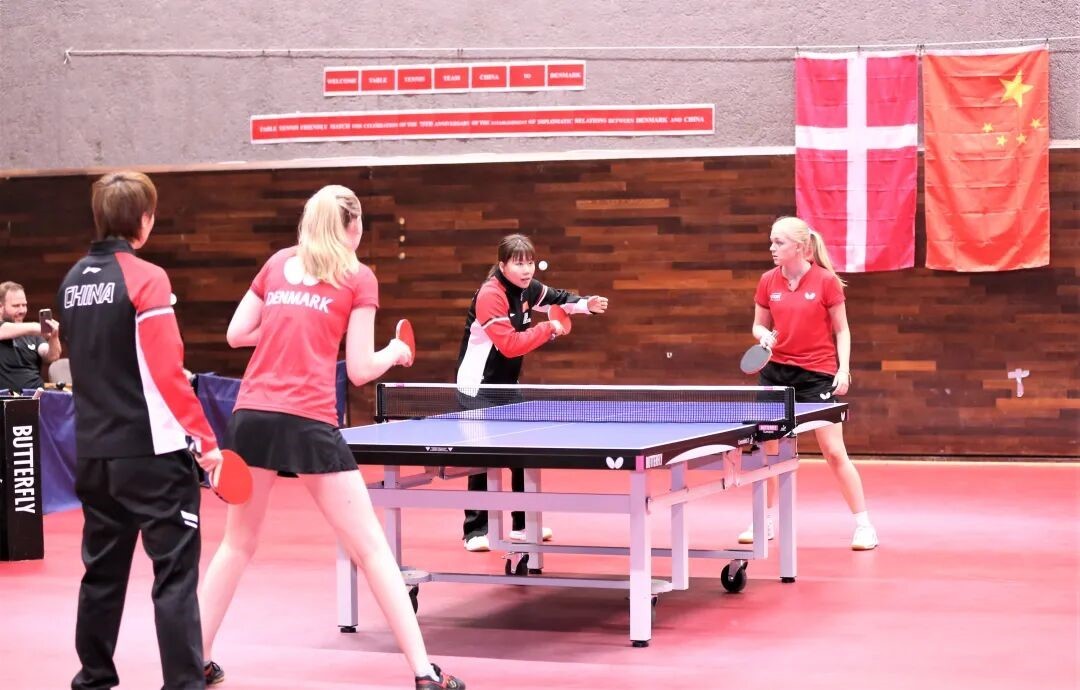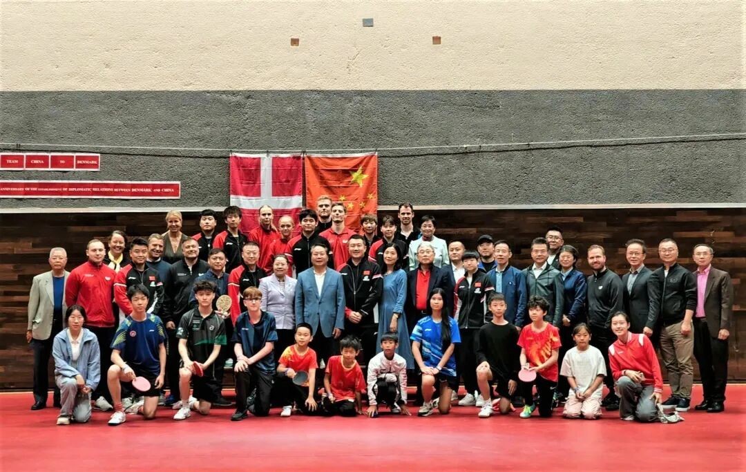 中丹乒乓球運(yùn)動員交流互動。中國駐丹麥大使館供圖
