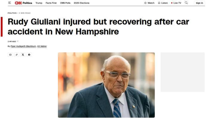 據(jù)報(bào)道,朱利安尼的發(fā)言人拉古薩在社交媒體上發(fā)布聲明稱,當(dāng)?shù)貢r(shí)間8月30日晚,朱利安尼乘坐的車輛遭后方車輛“高速撞擊”,隨后他被送往附近的創(chuàng)傷中心接受治療,“在那里他被診斷出胸椎骨折、多處撕裂傷和挫傷,以及左臂和小腿受傷”。