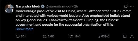 莫迪發(fā)帖稱:“我結(jié)束了對中國富有成效的訪問,期間,我出席了上合組織峰會,并與多名國家領(lǐng)導(dǎo)人進行了交流。我還闡述了印度在全球關(guān)鍵議題上的立場。感謝中國國家主席習(xí)近平、中國政府以及人民成功組織了此次峰會。”