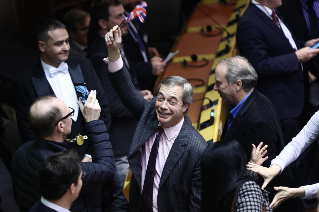 2020年1月29日,在比利時布魯塞爾,英國“脫歐黨”領(lǐng)袖、歐洲議會議員奈杰爾·法拉奇在英國“脫歐”協(xié)議投票結(jié)果公布后慶祝。新華社記者鄭煥松攝