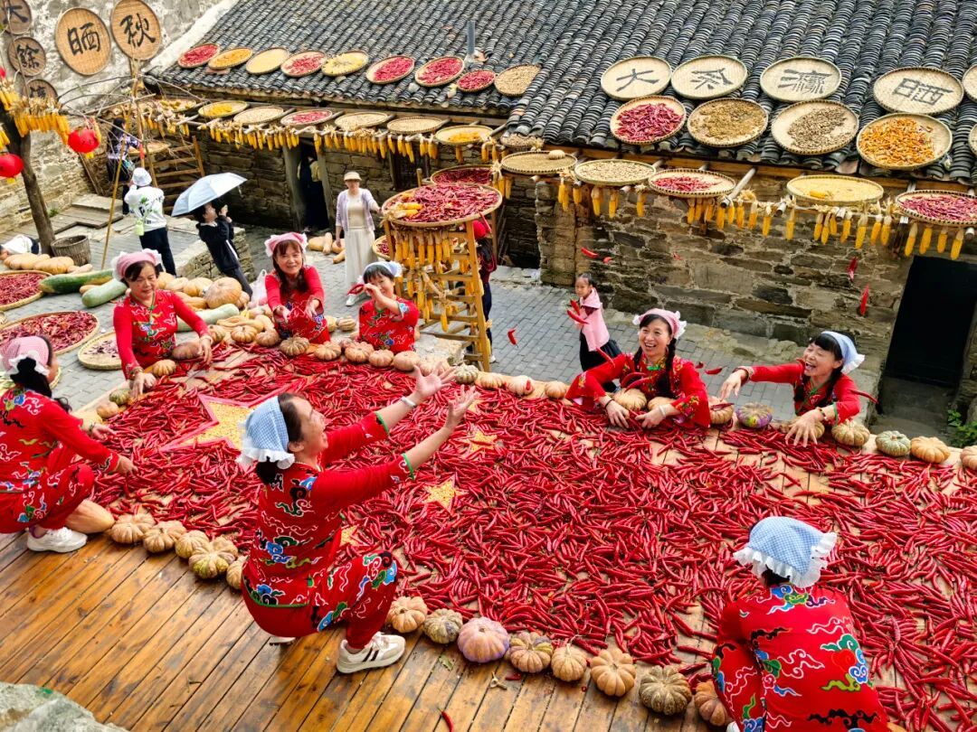在大余灣,曬秋是鐫刻在石墻黛瓦間的詩意。簸箕托起整個秋天的饋贈——火紅的辣椒、金黃的玉米、橙黃的南瓜、褐色的板栗……層層疊疊鋪展在檐下、院中、屋頂,與明清時期的古建筑交相輝映,潑灑出中國最生動的秋日油畫。
