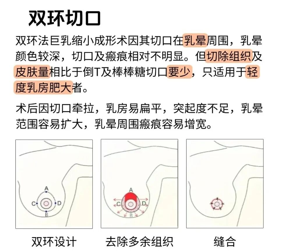 這是一種經(jīng)典的巨乳縮小術(shù)式。通過精心設(shè)計(jì),去除多余的組織、脂肪和皮膚,并將乳頭乳暈復(fù)合體移位至新高點(diǎn),最后縫合為一個(gè)圍繞乳暈的“棒棒糖”狀或垂直短瘢痕切口。