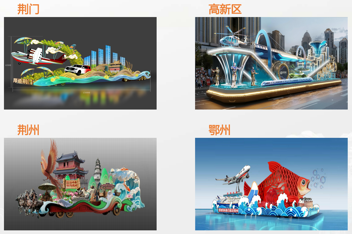 3、“楚風(fēng)漢韻”花車:《鳳舞楚天》、《問(wèn)道武當(dāng)》、《神農(nóng)架梆鼓》、知音號(hào)、《西蘭卡普》;