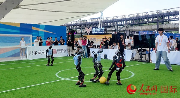 在服貿(mào)會體育服務(wù)展區(qū),機器人踢足球吸引觀眾駐足。人民網(wǎng)記者 吳凱攝