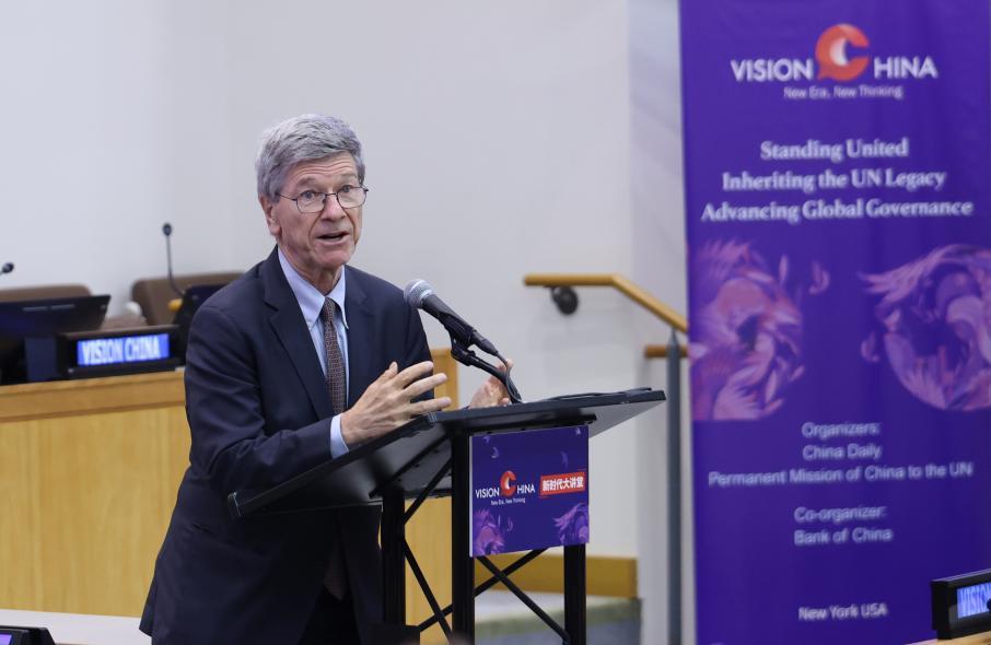 哥倫比亞大學(xué)可持續(xù)發(fā)展中心主任、教授杰弗里·薩克斯發(fā)表演講。中國(guó)日?qǐng)?bào)記者 馮永斌 攝