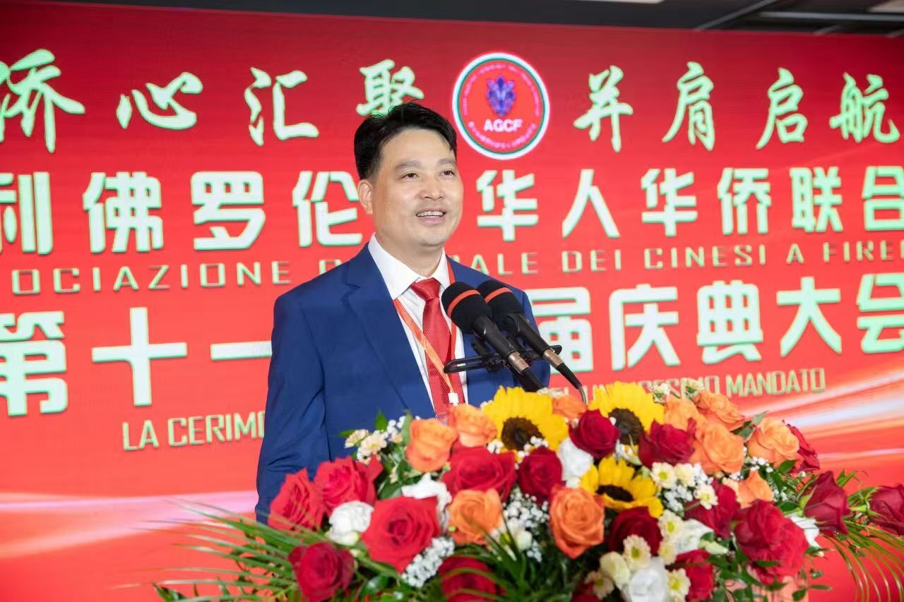 意大利佛羅倫薩華人華僑聯(lián)合總會(huì)新任會(huì)長(zhǎng)鄭再生致辭。 主辦方供圖