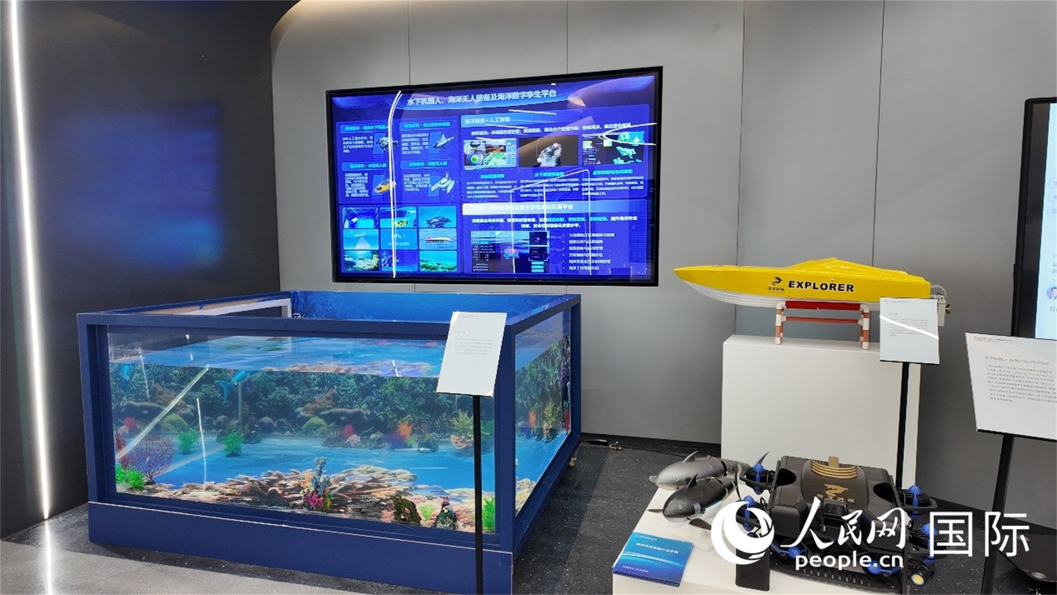 水下機(jī)器人、海洋無人裝備及海洋數(shù)字孿生平臺。人民網(wǎng) 張醴泉攝