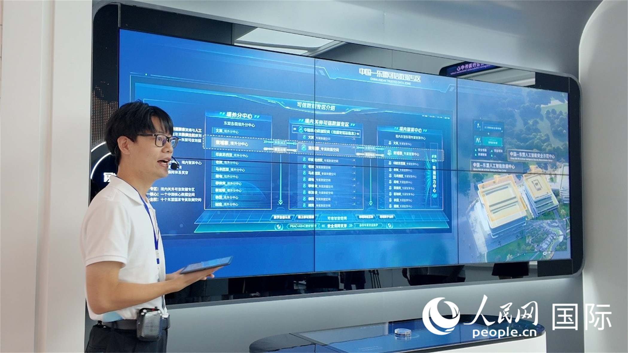 講解員正在為參觀嘉賓講解中心重點(diǎn)展示項(xiàng)目——中國—東盟可信數(shù)據(jù)專區(qū)。人民網(wǎng) 張醴泉攝