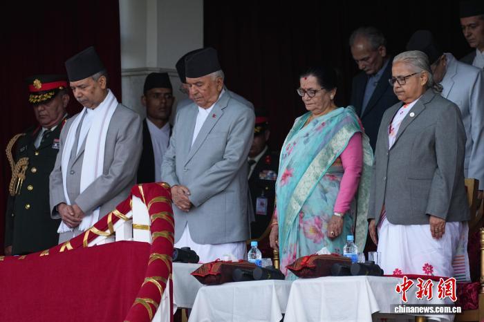 9月19日,尼泊爾臨時(shí)政府舉行憲法日暨國慶日慶?;顒?,尼泊爾總統(tǒng)鮑德爾(中)、臨時(shí)政府總理卡爾基(右一)等在活動開始前為近期示威游行死難者默哀。中新社記者 崔楠 攝