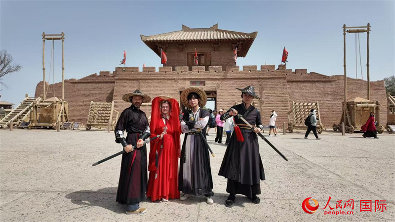 意大利藝術(shù)家馬泰奧、羅馬尼亞藝術(shù)家安德烈婭與中國藝術(shù)家吳穹等體驗中國傳統(tǒng)服飾。人民網(wǎng) 嚴小晶攝