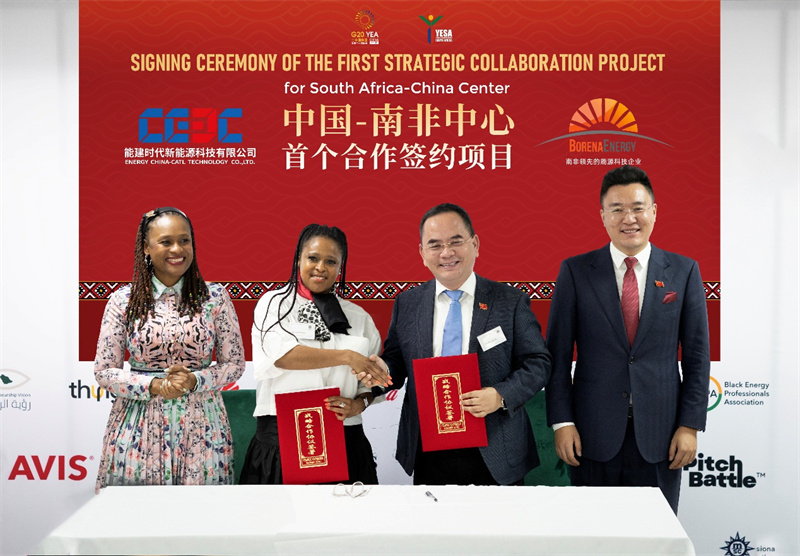 能建時(shí)代新能源科技有限公司黨委書(shū)記、董事長(zhǎng)黃慶豐先生與博雷納能源(Borena Energy)總經(jīng)理莫爾韋西·拉莫尼亞伊-通加(Morwesi Ramonyai-Thonga)女士現(xiàn)場(chǎng)簽約。G20青年企業(yè)家聯(lián)盟中國(guó)總部供圖
