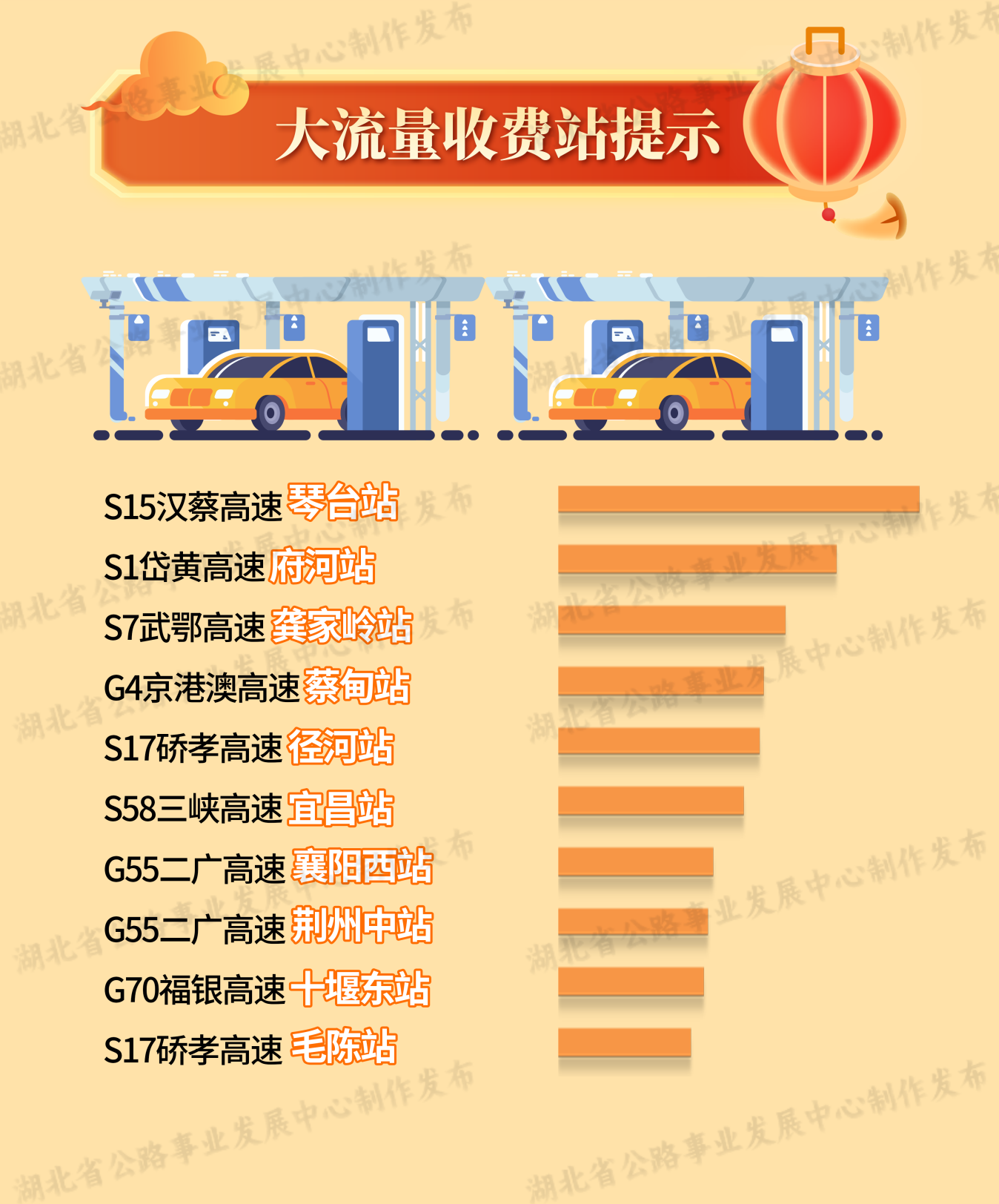 流量集中的高速公路收費(fèi)站主要有S15漢蔡高速琴臺(tái)站,S1岱黃高速府河站,S7武鄂高速龔家?guī)X站,G4京港澳高速蔡甸站,S17硚孝高速?gòu)胶诱荆琒58三峽高速宜昌站,G55二廣高速襄陽(yáng)西站、荊州中站,G70福銀高速十堰東站,S17硚孝高速毛陳站。