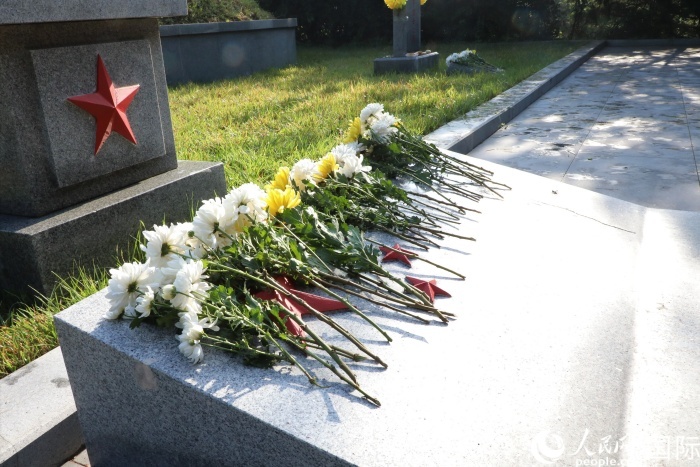 祭掃人員向志愿軍烈士獻花,整齊地擺放在墓碑前。 人民網(wǎng)記者 劉融攝
