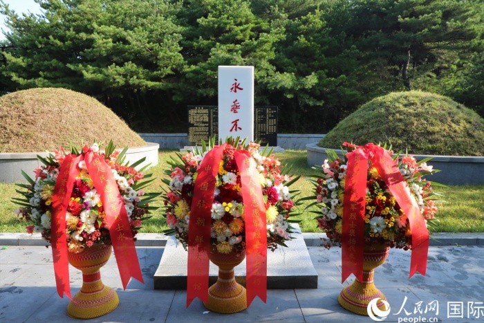 圖為順安中國人民志愿軍烈士陵園和祭掃人員敬獻的花籃。 人民網(wǎng)記者 劉融攝