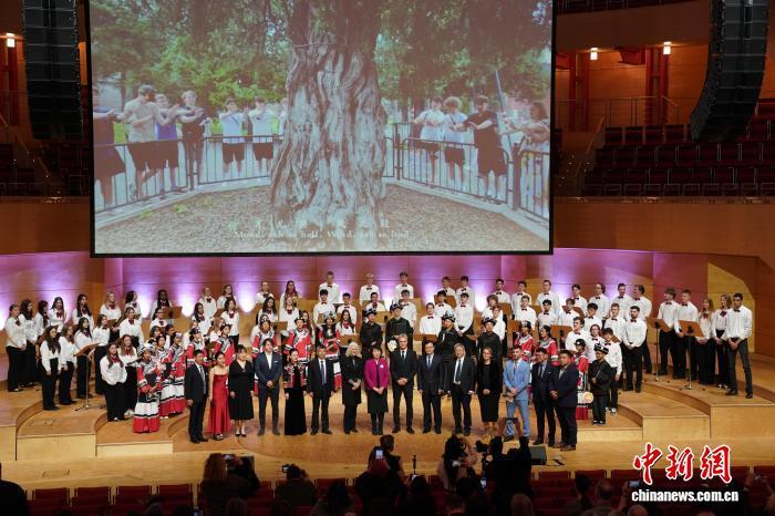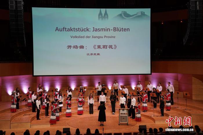 當地時間10月4日,中德青少年交流音樂會暨“唱歌學中文”夏令營匯報演出在德國埃森舉行。圖為中德青少年合唱開場曲《茉莉花》?!≈行律缬浾?馬秀秀 攝
